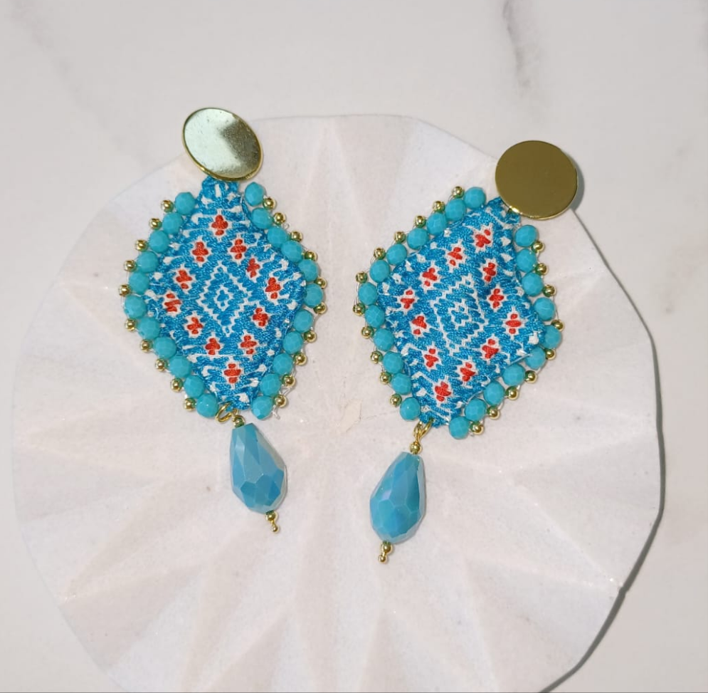 Diseñados en forma de rombo con fondo blanco, bordado en color azul turquesa, detalles en rojo y el contorno en cristales azul y dorados.