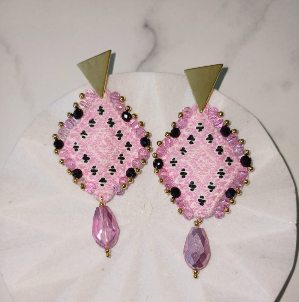 Diseñados en forma de rombo con fondo blanco, bordado en color rosa pastel, detalles en negro y el contorno en cristales rosa y dorados .