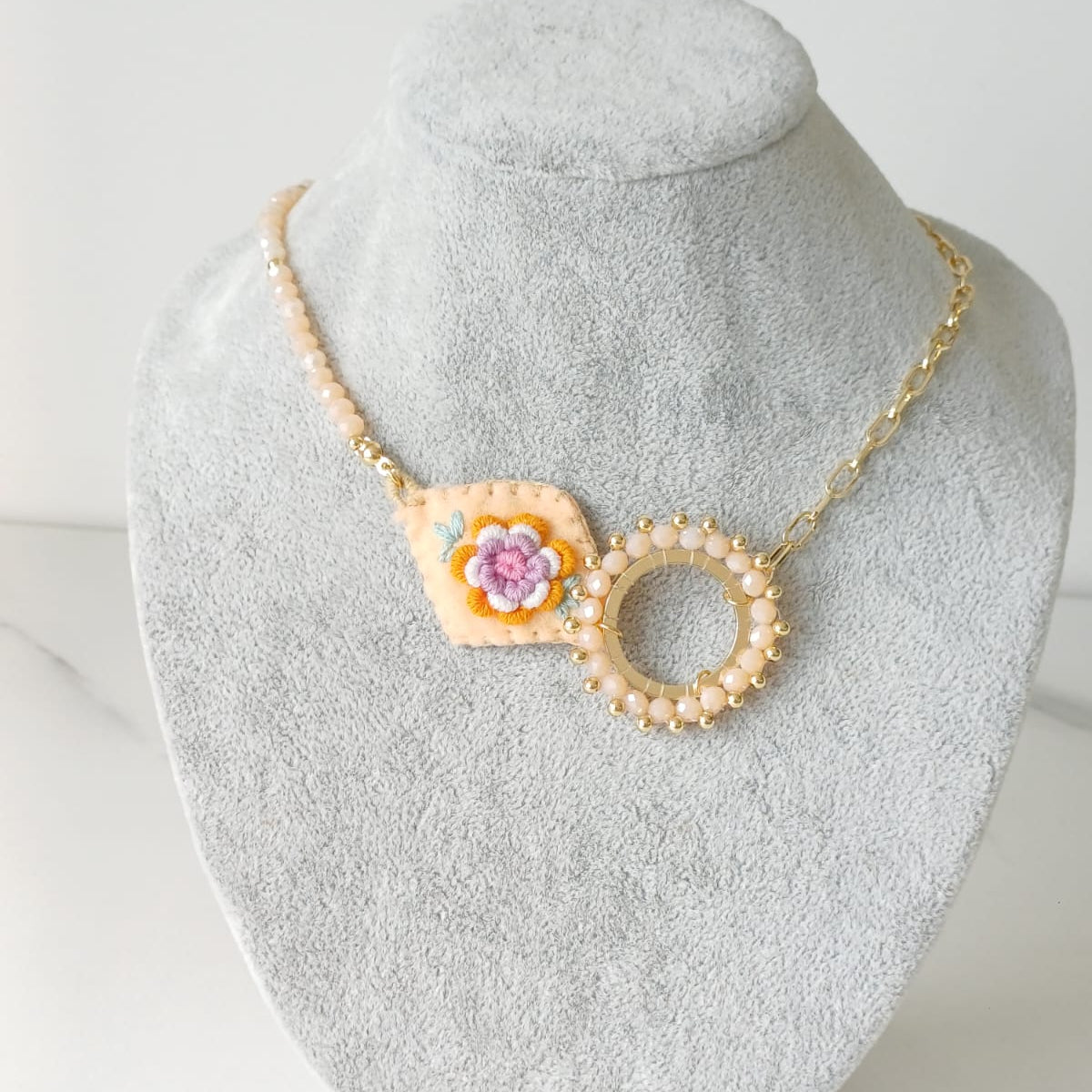 Collar de 40 a 50 cm en cadena de aluminio en chapa de oro y cristales en tono nute y dorado. Como pieza principal, un dije Diseñado en forma circular en cristales y un dije en forma de rombo bordado en rococo tonalidad nude, flor en Salmon, lila y nude.