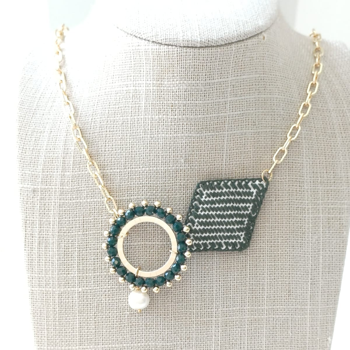 Una fusión de Arte y Diseño. Collar de 40 a 50 cm en cadena de aluminio en chapa de oro y cristales en tono verde bandera, perla y dorado. Como pieza principal, un dije Diseñado en forma circular en cristales, perla y un dije en forma de rombo bordado en tonalidad, verde obscuro y blanco. Modelo Exclusivo !
