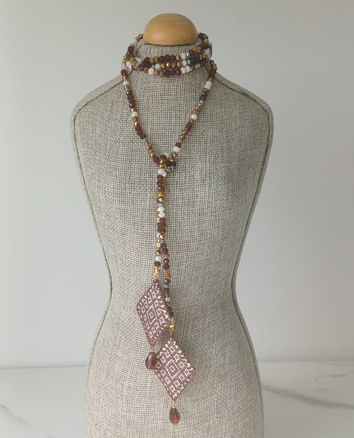 Corbatero de cristal en tono cafe, dorado y blanco. Como pieza principal, dos dijes en forma de rombo bordados, en fondo blanco hilo café.