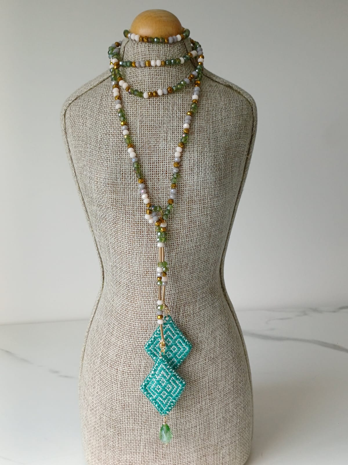 Corbatero de cristal en tono verde, dorado y blanco. Como pieza principal, dos dijes en forma de rombo bordados, en fondo blanco hilo verde.