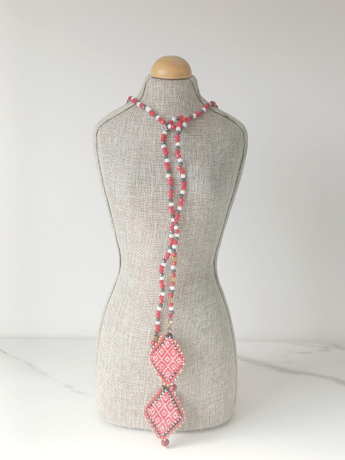 Corbatero de cristal en tono rojo, negro, dorado y blanco. Como pieza principal, dos dijes en forma de rombo bordados, en fondo blanco hilo rojo.
