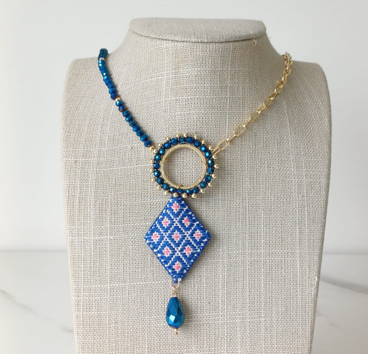 Collar de 40 a 50 cm en cadena de aluminio en chapa de oro y cristales en tono azul rey con dorado. Como pieza principal, un dije Diseñado en forma circular en cristales azul rey y otro dije en forma de rombo bordado en tonalidad azul, detalles en rosa y blanco.