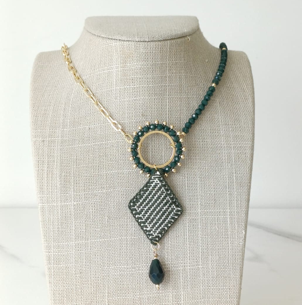 Collar de 40 a 50 cm en cadena de aluminio en chapa de oro y cristales en tono verde bandera con dorado. Como pieza principal, un dije Diseñado en forma circular en cristales verde bandera y otro dije en forma de rombo bordado en tonalidad verde obscuro y blanco.