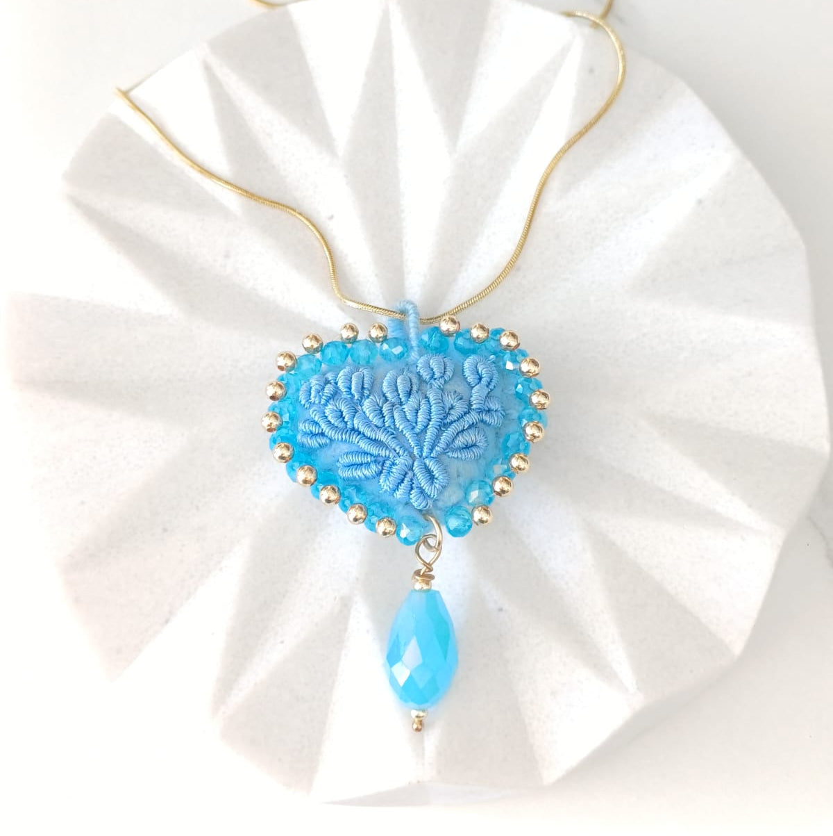 Cadena de 40 a 45 cm en acero. Como pieza principal un dije en forma de corazón en color celeste y fino bordado rococo, con el contorno en cristales celestes y dorados