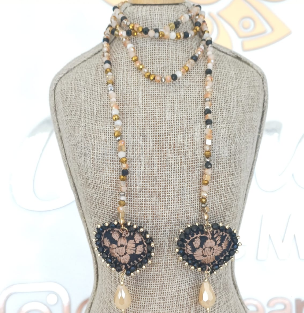 Corbatero de cristal en tono champagne, dorado, blanco y negro. Como pieza principal, dos dijes en forma de de corazón bordados, en fondo negro con hilo color champagne.