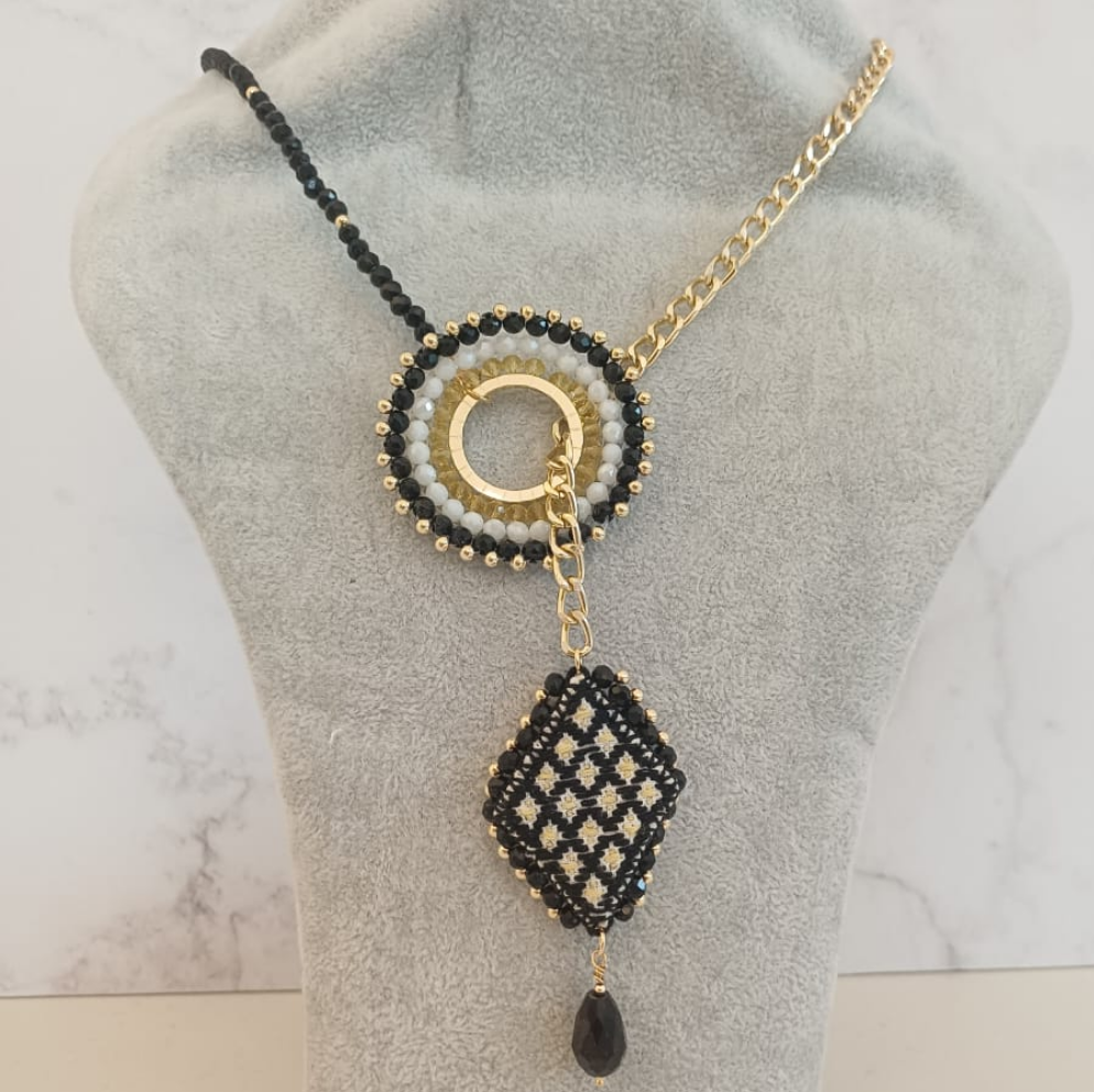 Collar largo en cadena de aluminio en chapa de oro y cristales en tono amarillo ligero, dorado, blanco y negro. Como pieza principal, un dije Diseñado en forma circular en cristales y un dije en forma de rombo bordado en tonalidad negro y amarillo.
