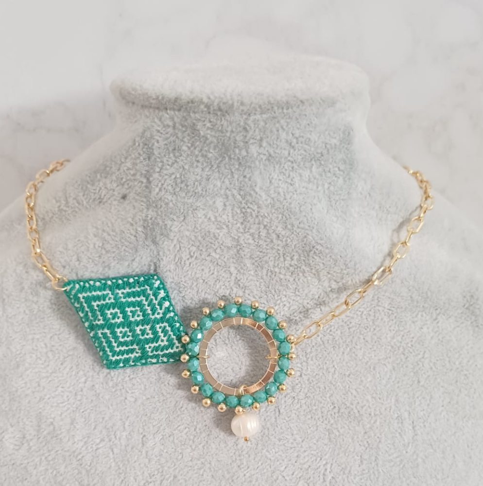 Como pieza principal, un dije Diseñado en forma circular en cristales y un dije en forma de rombo bordado en tonalidad verde acua y blanco.