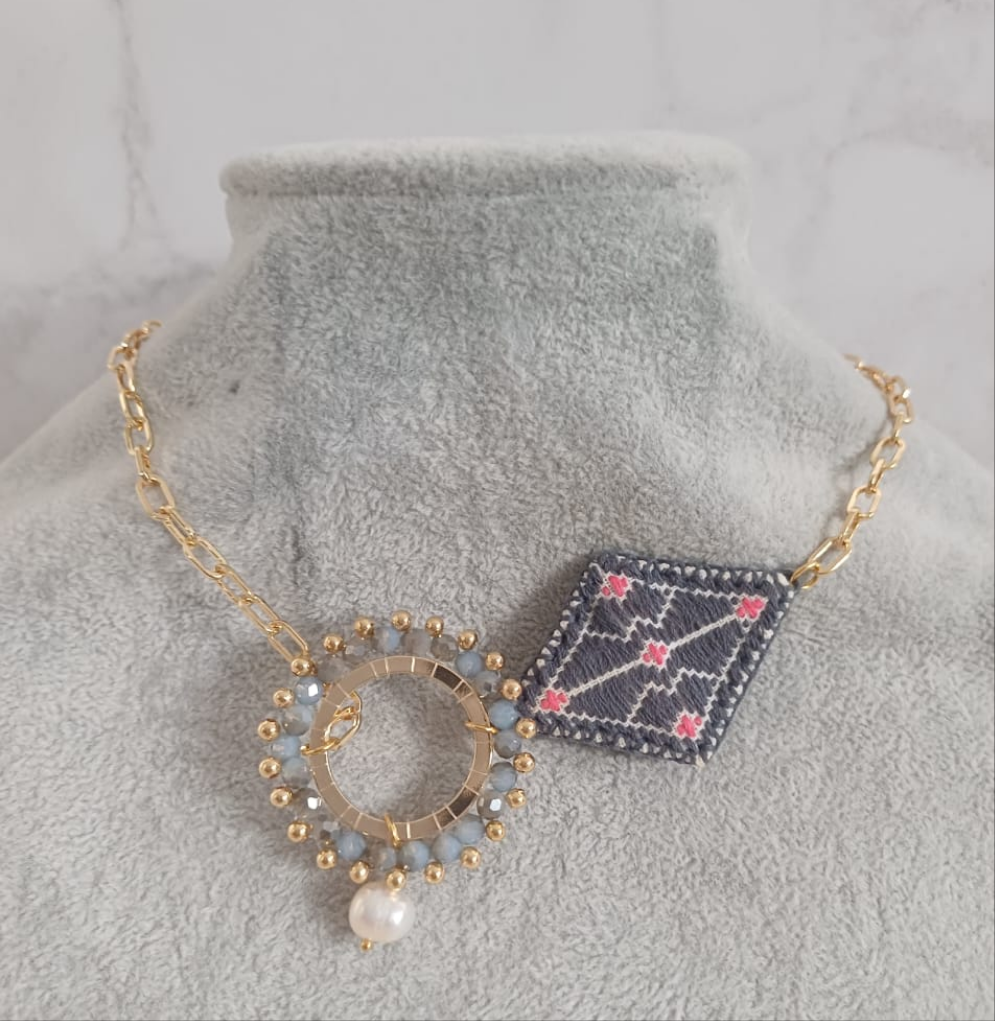 Collar de 40 a 50 cm en cadena de aluminio en chapa de oro y cristales en tono gris, perla y dorado. Como pieza principal, un dije Diseñado en forma circular en cristales y un dije en forma de rombo bordado en tonalidad gris, detalles rosa y blanco.