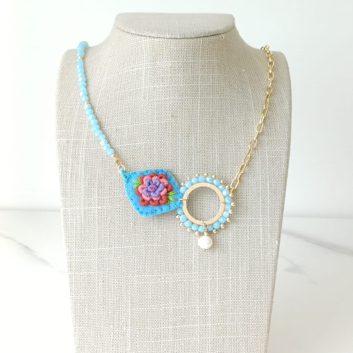 Collar de 40 a 50 cm en cadena de aluminio en chapa de oro y cristales en tono celeste y dorado. Como pieza principal, un dije Diseñado en forma circular en cristales ,perla y un dije en forma de rombo bordado en rococo tonalidad celeste , flor en shedron, rosa y lila.
