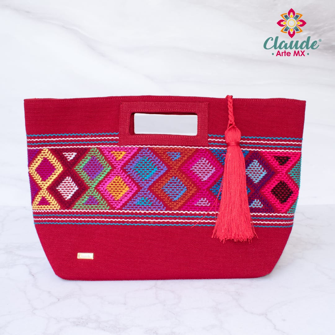 Bolsa de mano, base trasera en rojo, al frente también roja y el bordado en forma de cuadrado y triangulos en varios tonalidades. Mota color rojo.