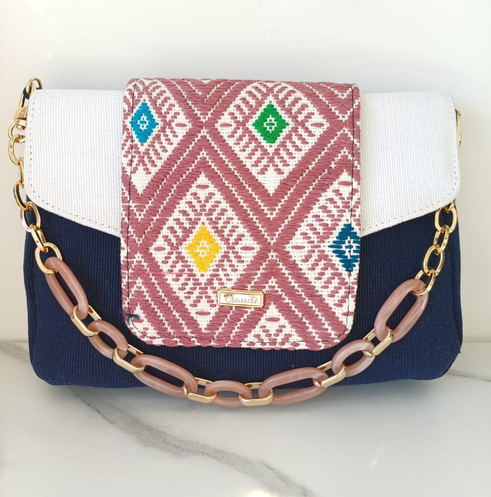Base de la bolsa color azul marino, al frente convinacion de blanco con bordados en forma de rombo predominando el color nute y diferentes tonos.