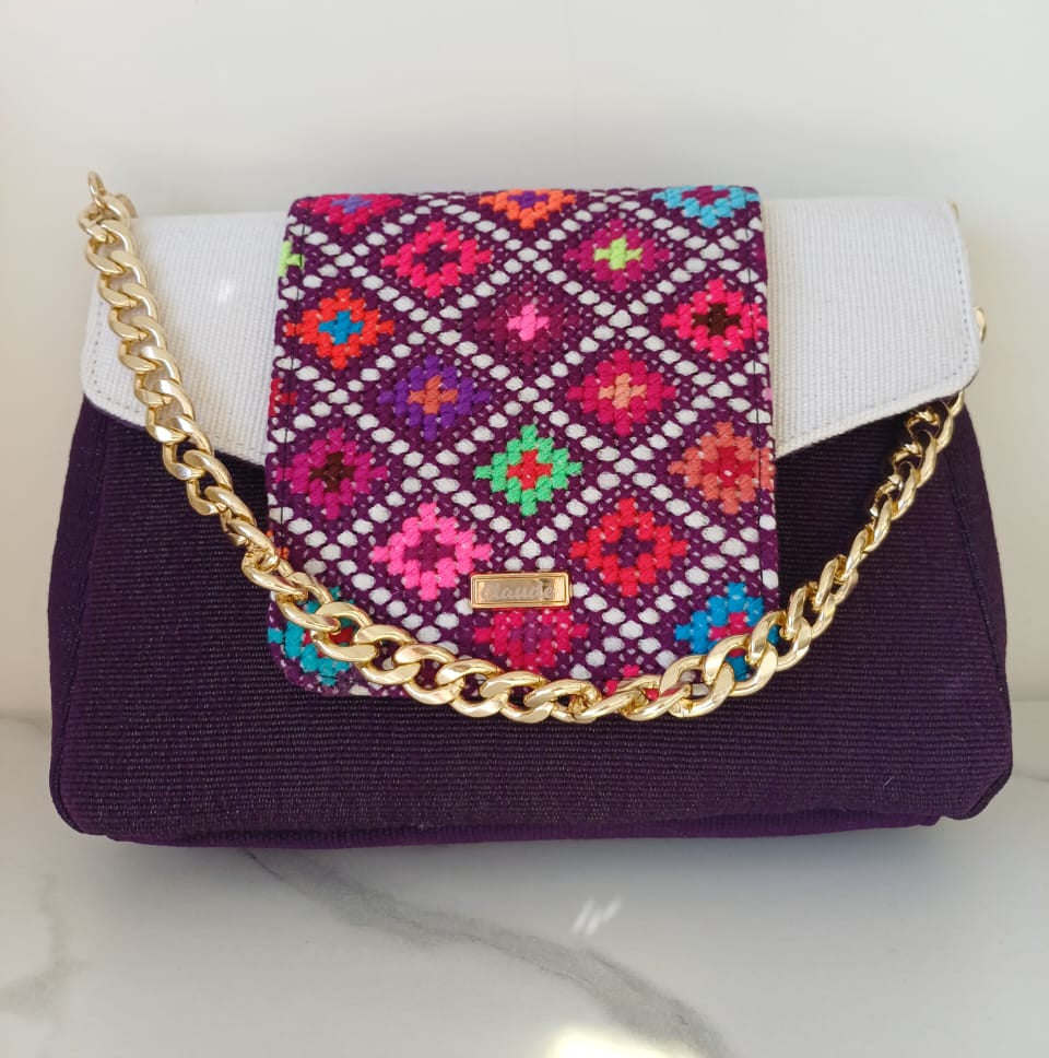 Base de la bolsa color morado uva, al frente convinacion de blanco con finos bordados en punta de cruz, predominando el color magenta y diferentes tonos.